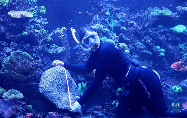 8月25日,在英国伦敦动物园,工作人员测量珊瑚长度。