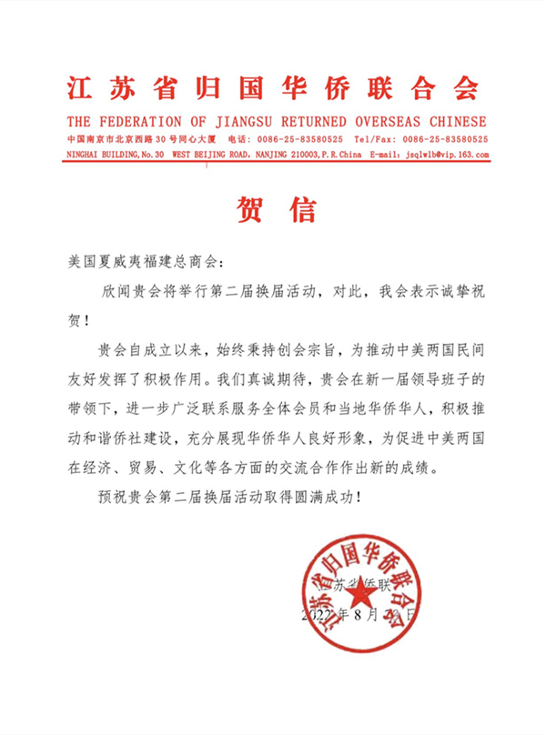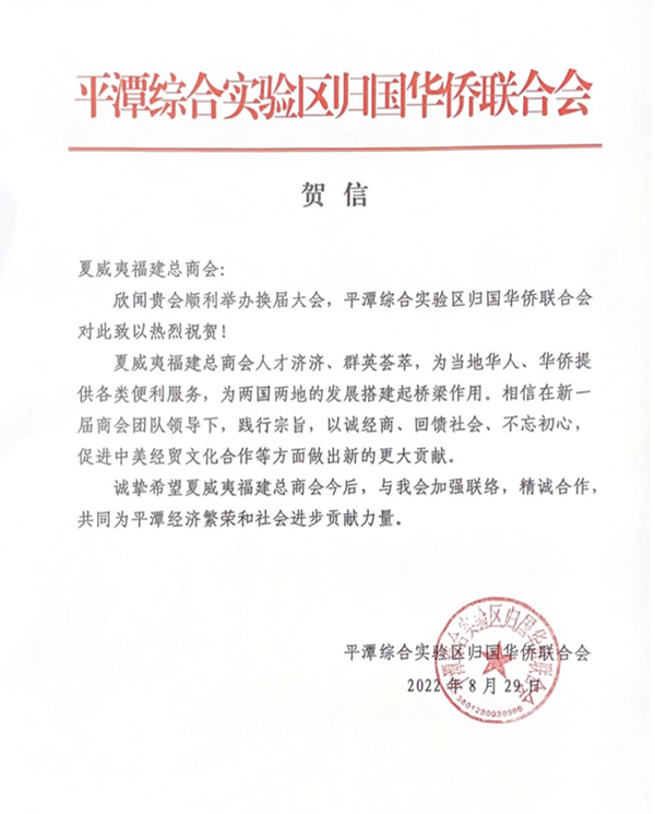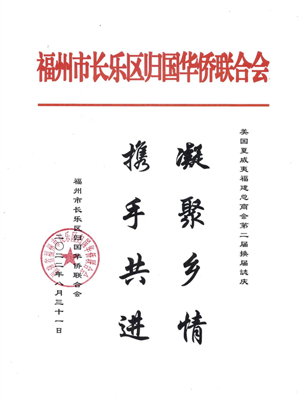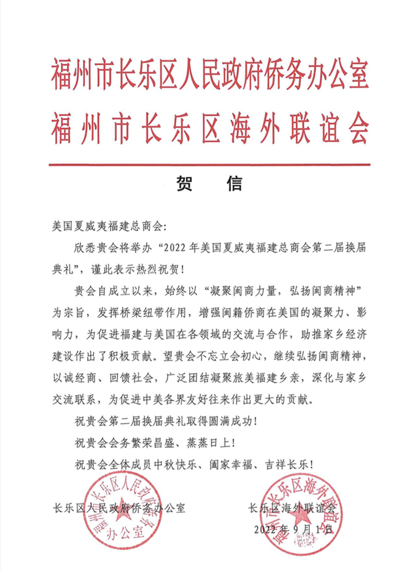 福州市长乐区人民政府侨务办公室、福州市长乐区海外联谊会贺信