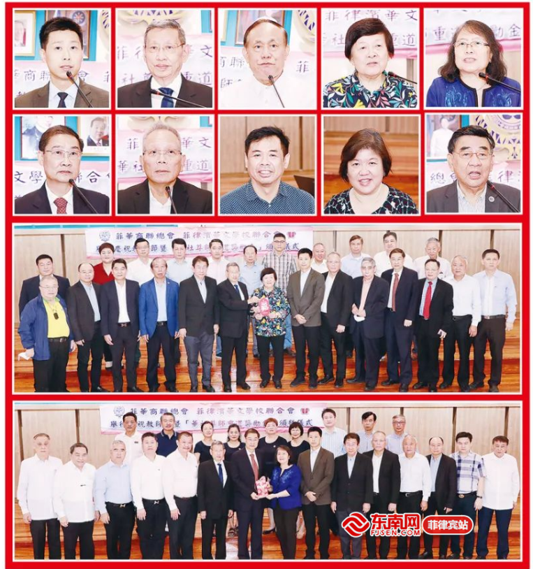 最上排从左到右依次是中国驻菲大使馆领事王晓东、商总副理事长施梓云、华文学校联合会常务理事林文诚、在职教师刘忆椿、华文学校联合会退休教职员联谊会会长陈璀莹。第二排从左到右依次是菲律宾晋江同乡总会理事长陈凯复、商总文教委员会董事兼主任洪健雄、华文学校联合会常务理事黄思华、华文学校联合会轮值主席陈惠玲、商总秘书长颜长江。下两张为颁发仪式现场合影。