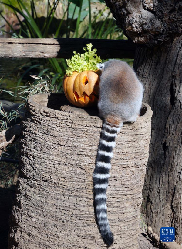 10月30日,在意大利罗马动物园,环尾狐猴享用节日南瓜。