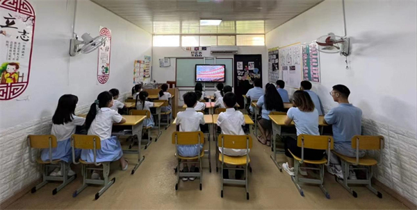 柬埔寨中华国际学校校长朱邦疆与该校学生共同收看中共二十大开幕会