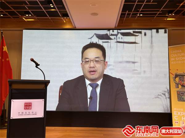 悉尼中国文化中心主任兼驻悉尼旅游办事处主任肖夏勇、澳大利亚美术家协会主席彭伟开现场致辞,江苏省外办副主任刘建东、江苏省文化和旅游厅副厅长李川视频致辞。