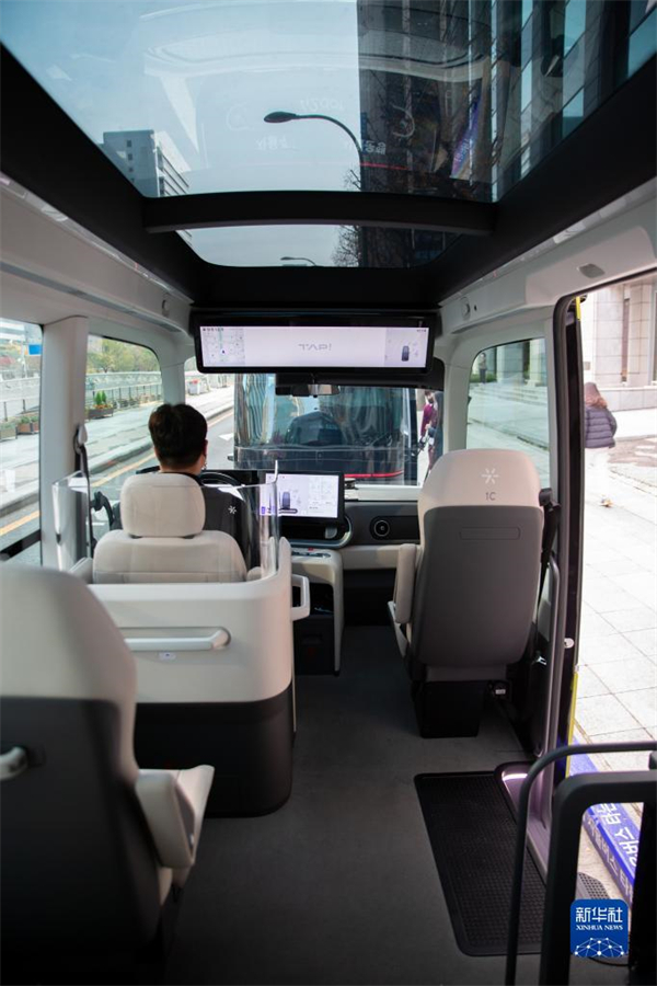 这是11月24日在韩国首尔拍摄的自动驾驶巴士内部。