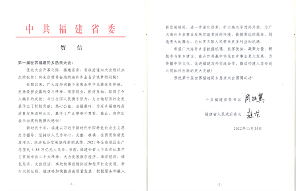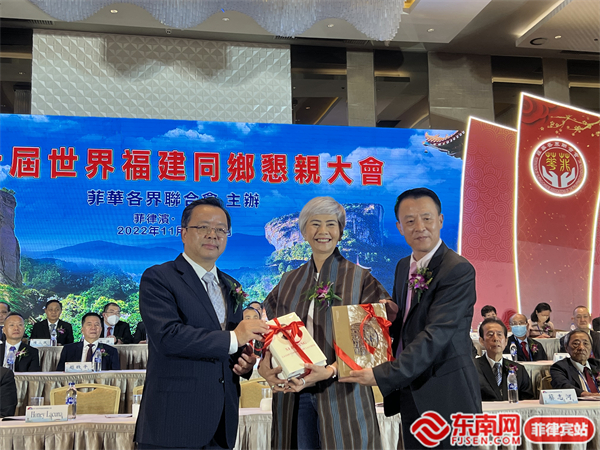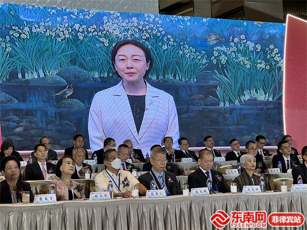 菲华各界联合会名誉主席戴宏达宣读了中共福建省委贺信。受福建省委书记周祖翼、省长赵龙的委托,福建省委常委、常务副省长郭宁宁为本次活动发来祝贺视频,她代表福建省委、省政府和4200万家乡人民对大会的成功召开表示热烈祝贺,向世界各地的福建乡亲表示诚挚问候和祝福。