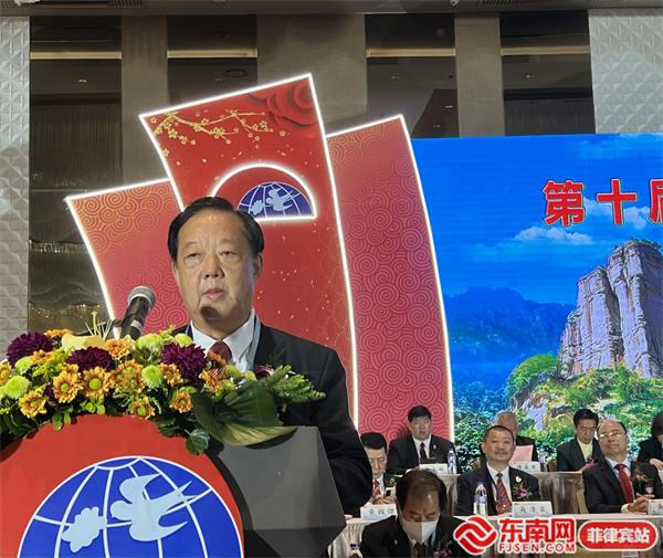 黄溪连大使对第十届世界福建同乡恳亲大会的召开表示热烈祝贺,高度赞扬闽籍乡亲秉持爱国爱乡的优良传统,为促进祖(籍)国和家乡经济社会发展以及中外友好合作作出的重要贡献。他表示,世界福建同乡恳亲大会自从1994年首次举办以来,受到各国闽籍乡亲的广泛关注和热烈参与,现已发展成为规模最大、层次最高、最具影响力的国际闽籍乡亲联谊交流活动,它犹如一条亲情的纽带,把海内外八闽儿女紧紧地联系在一起。大家在这个平台上共叙血脉乡谊、共享发展经验、共话合作交流。此次大会系新冠疫情暴发以来首次举办,必将为促进全球闽籍乡亲的团结与合作作出重要贡献。世界福建同乡恳亲大会首次在菲落户,有助于展示在菲闽籍同胞的精神风貌,促进菲华闽籍侨团与世界各地侨团的交流互鉴。他勉励海内外闽籍乡亲以此次大会为契机,团结协作、踔厉奋发、勇毅前行,汇聚起奋进新时代新征程的强大合力,为促进福建对外交流合作,为深化中国与世界各国友好交往,为推动构建人类命运共同体贡献智慧和力量。