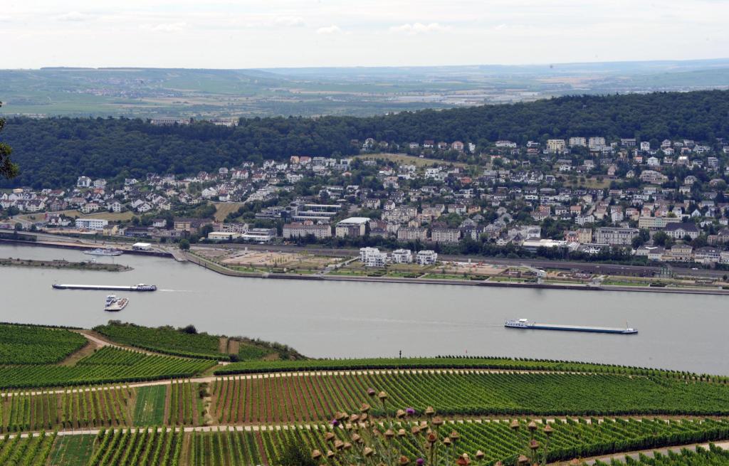 图为莱茵河畔吕德斯海姆山上的葡萄园和河对岸的小城宾根(2011年7月15日摄)。新华社记者 马宁 摄