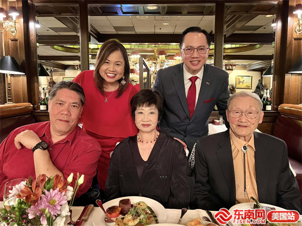 新泽西理工学院校长林竹进、翁润珍伉俪(左三、左四)与林洁辉、严欣铠伉俪(右二、右一)等社区人士交流