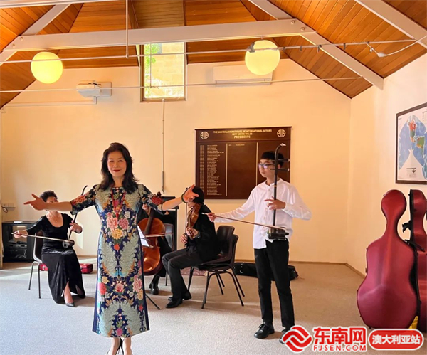 在二胡的伴奏下,中国民族女高音歌唱家、国家一级演员雅芬演唱歌曲《茉莉花》,这首中国经典民歌,赢得了现场观众热烈的掌声。她还演唱了另一首歌曲《高山流水》,将演出推向高潮。雅芬应邀专程从堪培拉来到悉尼参加本次活动。她表示非常感谢主办方的邀请,能够参与如此有意义的活动。在活动现场,雅芬向澳大利亚国际事务研究所赠送了她的专辑《芬芳中华》。