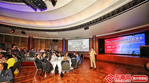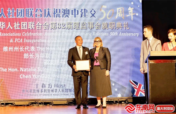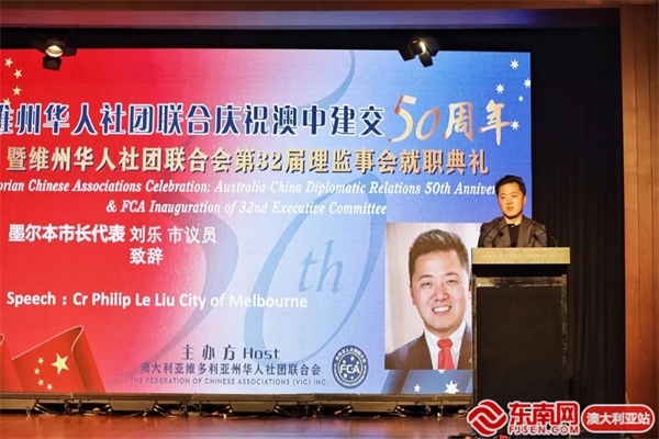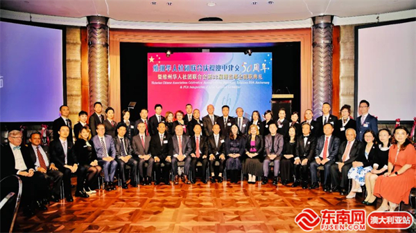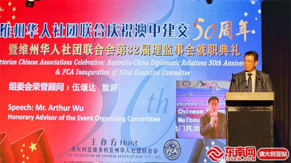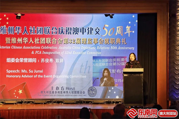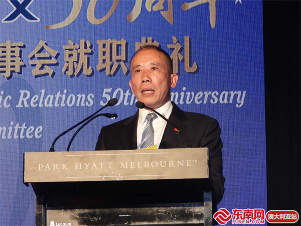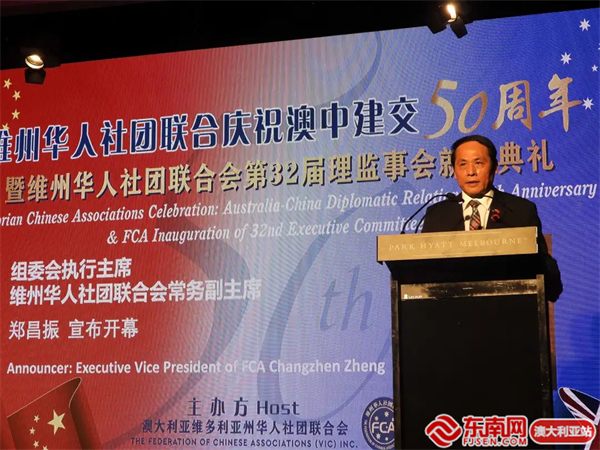 东南网澳大利亚12月20日讯(本网特约记者 一禾)当地时间12月17日,澳大利亚维州华人社团联合会(以下简称“华联会”)在墨尔本举行庆祝中澳建交50周年暨维州华人社团联合会第32届理监事会就职典礼。中国驻墨尔本总领馆代总领事曾建华出席并致辞,澳洲政界、商界、侨界代表近400位嘉宾参加活动。