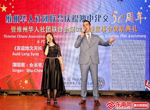 知名歌手俞淑琴和英文主持人帕特里克(Patrick)合唱歌曲《友谊地久天长》,用歌声献上了最美祝福,祝愿中澳友谊地久天长。本次庆典的艺术导演刘正敷朗诵了他的原创叙事诗《建交往事——献给澳中建交50周年》。与会嘉宾们一起观看了极具历史感的中澳建交影像资料,共同回顾了中澳建交50周年两国友好交往的珍贵历史时刻。