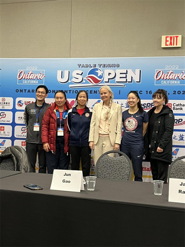 美国乒乓球队教练高军(左二)、叶瑞玲(左三)、国际乒联主席佩特拉·索林(右三)、张安(右二)合影