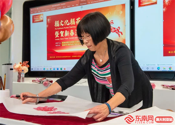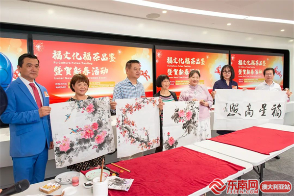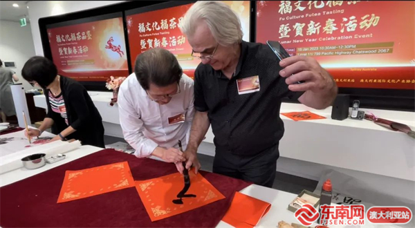 当天还举行了福文化春节笔会,书法家、澳大利亚书法家协会主席王鹤在现场书写“福”“福星高照”等字,澳大利亚书画家协会主席邓学英现场作画,现场洋溢着浓浓的艺术氛围。