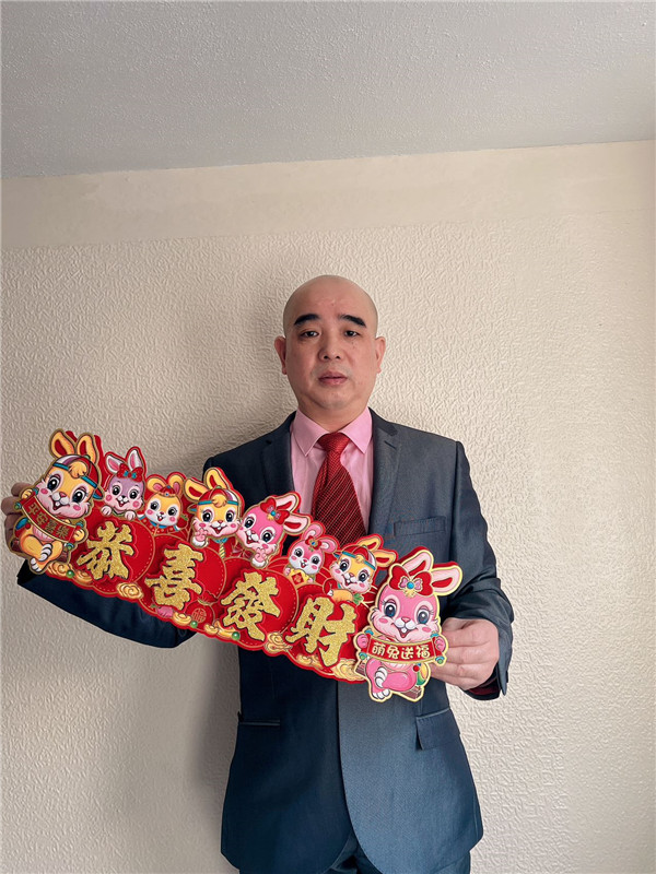 我是英国福建社团联合总会副主席兼全英中华饮食业总商会副会长刘国良。在这辞旧迎新之际,我向海内外华侨华人拜年!衷心祝福大家新春快乐,兔年大吉!祝愿明天的世界更美好,也祝愿大家事业兴旺、阖家幸福、身体健康、万事如意!
