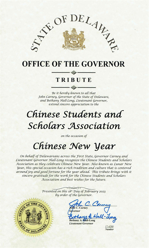 美国联邦参议员托马斯·卡伯(Thomas R.Carper) 、克里斯托弗·考恩斯(Christopher A.Coons)、丽莎·布朗特·罗切斯特(Lisa Blunt Rochester)、特拉华州州长约翰·卡尼(John C.Carney)、副州长贝瑟尼·霍尔隆(Bethany A. Hall Long) 以及特拉华大学校长丹尼斯·阿桑尼斯(Dennis Assanis)与夫人埃莱尼·阿桑尼斯(Eleni Assanis) 、全球项目和服务中心(CGPS)主任拉维·艾密甘(Ravi Ammigan)等向本次活动发来视频演讲或贺信,用不同形式向该校中国留学生表示祝贺。
