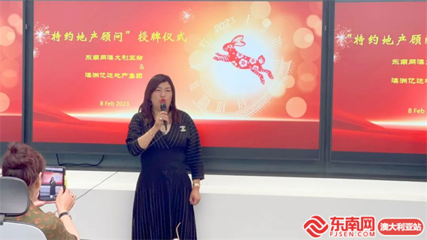 东南网澳大利亚站采访部主任兰木致欢迎辞,她介绍了东南网在国内外的发展情况。亿达地产集团深耕当地房地产行业多年,此次被授予“特约地产顾问”,她希望可以整合双方优质资源,让专业人做专业事,共创美好明天。