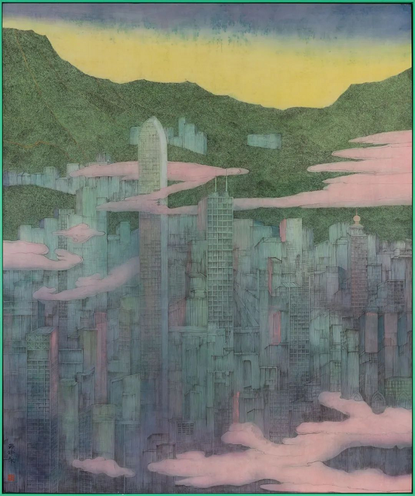 《山・海・城》尺寸:200x240cm,彩墨绢本,2022年