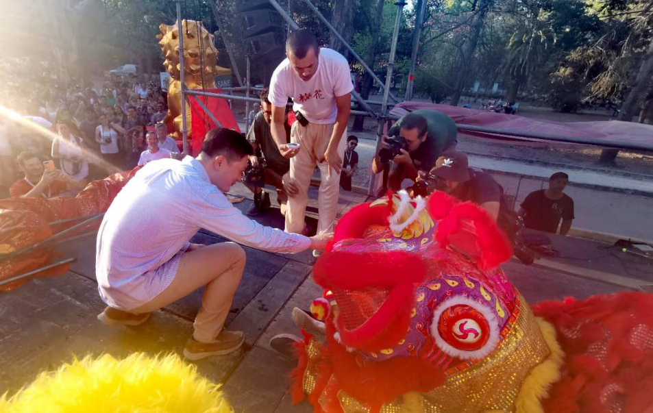 下午五点,舞狮点睛活动将庙会推向高潮。孙怡公参为活动致辞,对活动给予了高度赞扬,对阿根廷政府及群众对中国文化的大力支持表示感谢,并希望中阿友谊长存。随后孙怡、陈兴、拉斐尔、龙敏利等持笔为舞狮点睛,台下观众的掌声经久不衰,为中阿友谊喝彩。