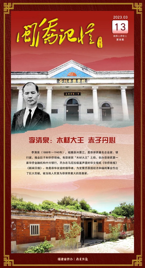 李清泉(1888年~1940年),祖籍泉州晋江,是菲律宾著名企业家、银行家、报业巨子和华侨领袖,有菲律宾“木材大王”之称。创办菲律宾第一家华侨金融机构中兴银行,开办在马尼拉极富声望的华文报纸《华侨商报》《新闽日报》。他是菲华友谊的倡导者,为发展侨居国经济和福利事业作出了巨大贡献,被当地人民誉为菲律宾最大的慈善家。