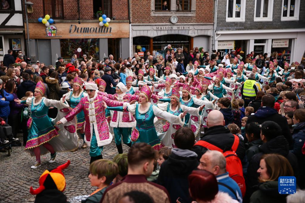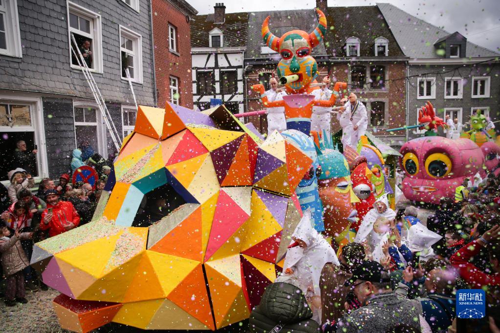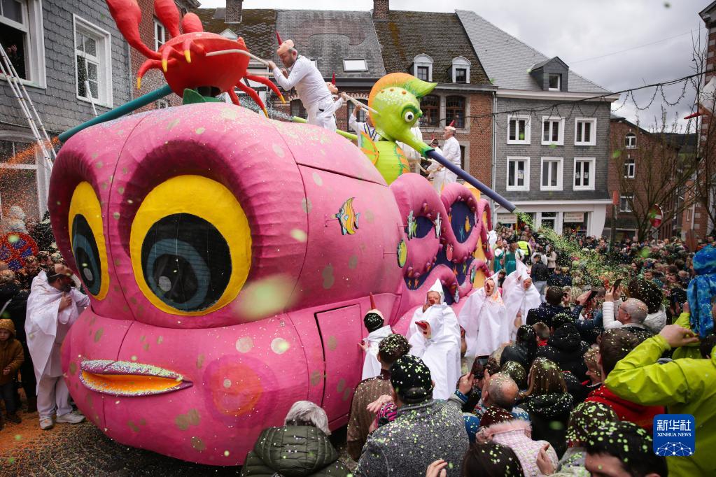 3月19日,在比利时东部的小城斯塔沃洛举行的狂欢节游行上,表演者向人们抛洒碎纸片。