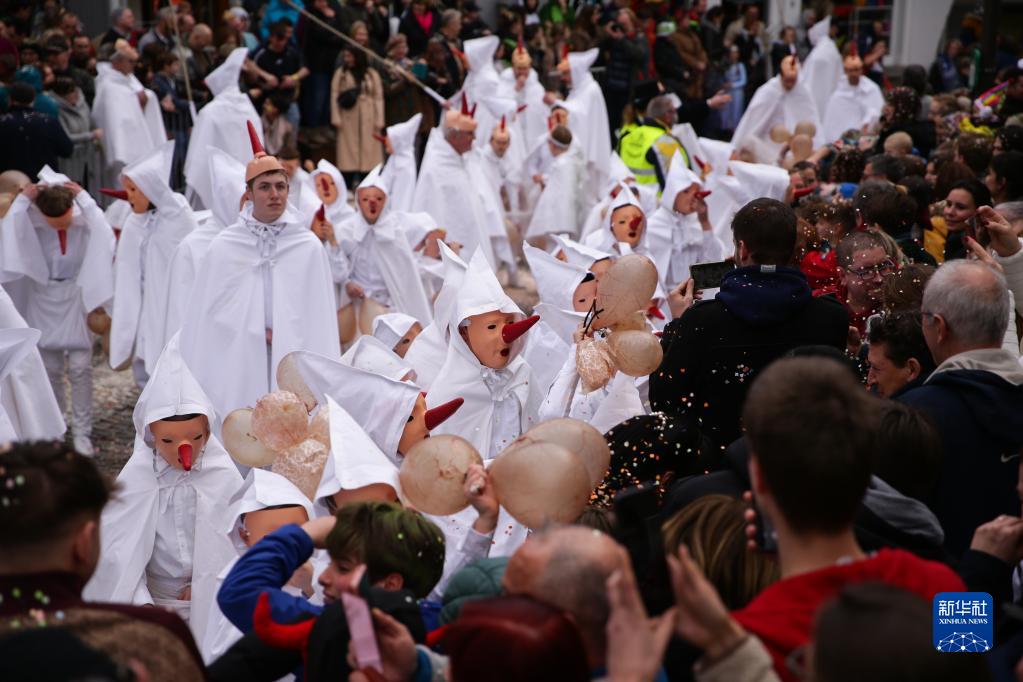 3月19日,在比利时东部的小城斯塔沃洛举行的狂欢节游行上,装扮成“白衣人”形象的表演者用吹起的猪膀胱敲打路人的头。