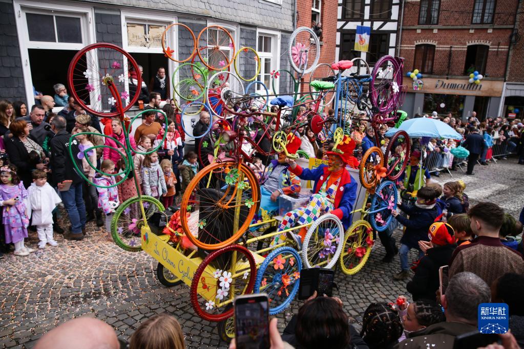 3月19日,在比利时东部的小城斯塔沃洛,人们参加狂欢节游行。