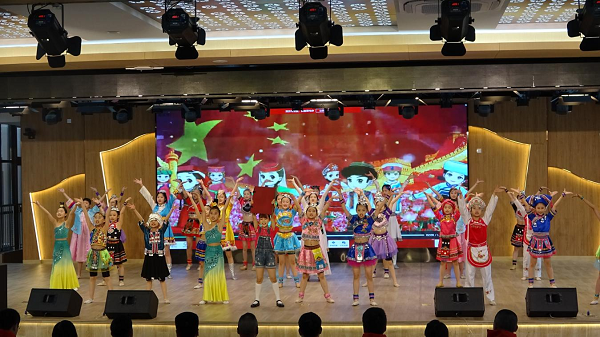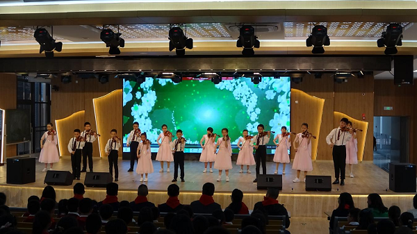 接下来,是一堂精彩多元的文艺班会课。班会课开场,少先队员向现场嘉宾敬献红领巾。紧接着,便是一场视听盛宴,每个节目都表达了新时代少年们对祖国的热爱。一支蕴含深情厚爱的歌舞《让幸福的地方更加幸福》、一首让人激情澎湃的《走西口》、一曲令人沉醉的小提琴演奏的《茉莉花》、一篇铿锵有力的朗诵《读中国》,都一一展现了新时代学生奋发向上、意气风发的精神面貌。在知识竞答环节,小学生们纷纷举手抢答,现场气氛紧张而又热烈。