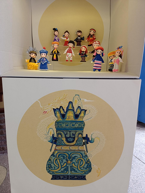活动现场展出了百余件以“最炫民族风”为主题的书画、剪纸以及手工艺品。橱窗里陈列了学生们制作的活灵活现的具有民族特色的陶艺作品,展示架上挂满了各式惟妙惟肖的绘画作品,屏风上的“民族团结花常开,各族人民一家亲”等书法作品字迹隽秀,各具特色,还有别出心裁的DIY手提袋、手机壳、明信片等文创作品。