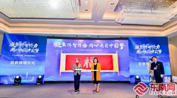 峰会上,由福建省委统战部二级巡视员张志英携手福建日报社副总编辑任君翔为侨领们揭开“百字福”卷轴,将活动推向了高潮。