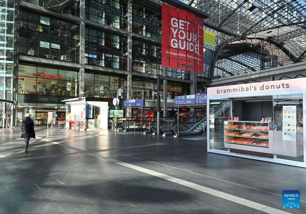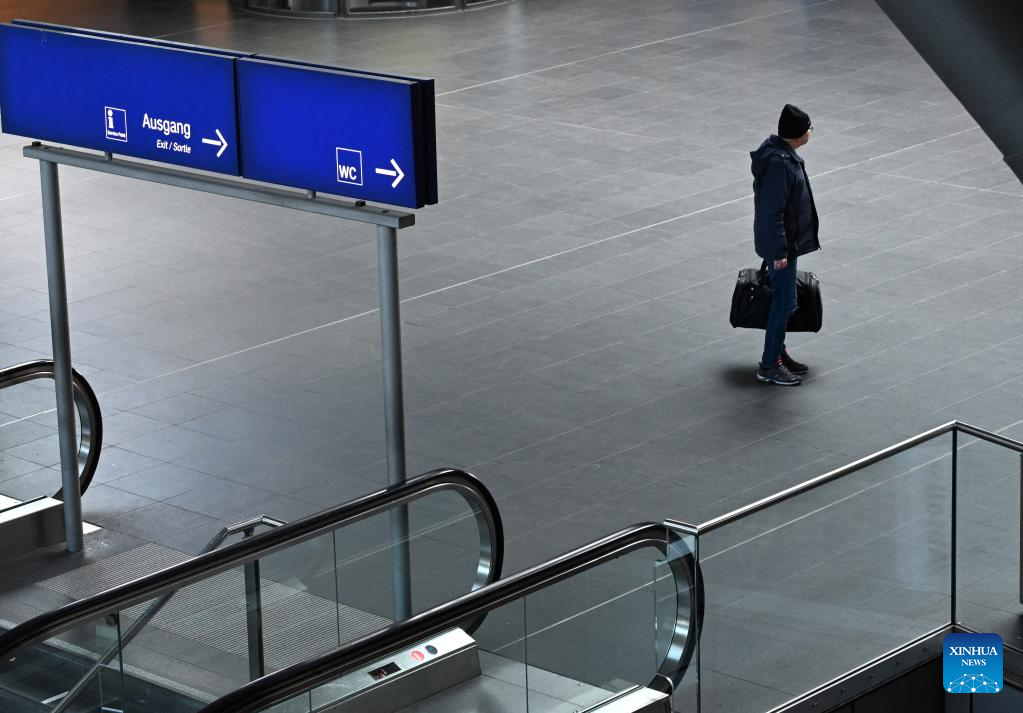 A person is seen at Berlin Central Train Station in Berlin, Germany, on March 27, 2023. Nationwide strikes in Germany brought train, bus, and airplane traffic to a virtual standstill on Monday, affecting millions of travelers. Freight traffic was also heavily disturbed. (Photo by Stefan Zeitz/Xinhua)