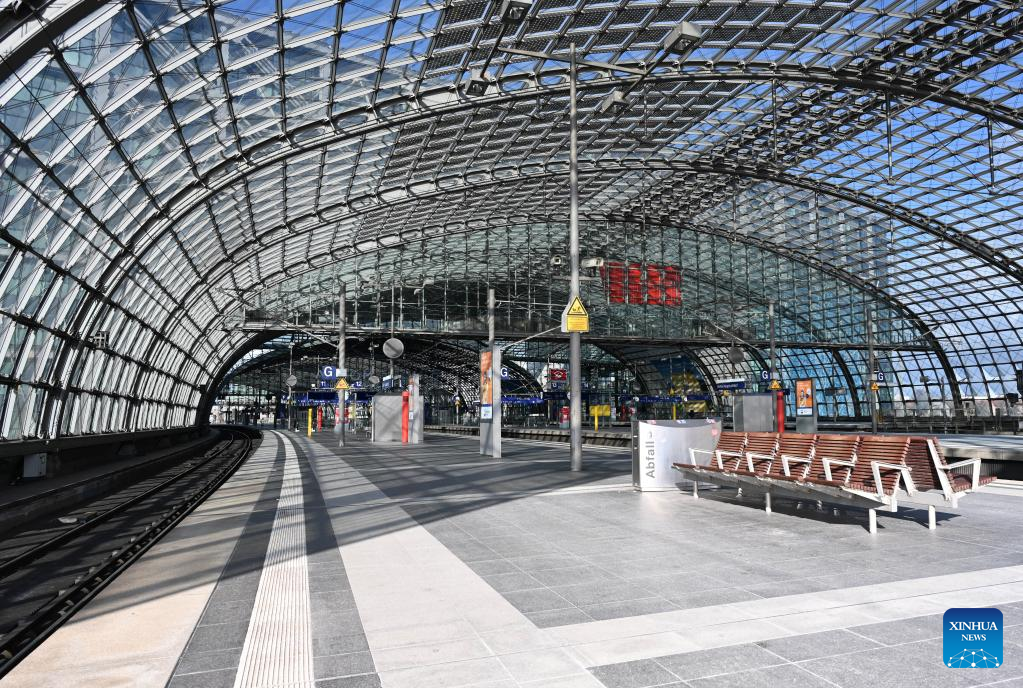 Photo taken on March 27, 2023 shows platforms of Berlin Central Train Station in Berlin, Germany. Nationwide strikes in Germany brought train, bus, and airplane traffic to a virtual standstill on Monday, affecting millions of travelers. Freight traffic was also heavily disturbed. (Photo by Stefan Zeitz/Xinhua)