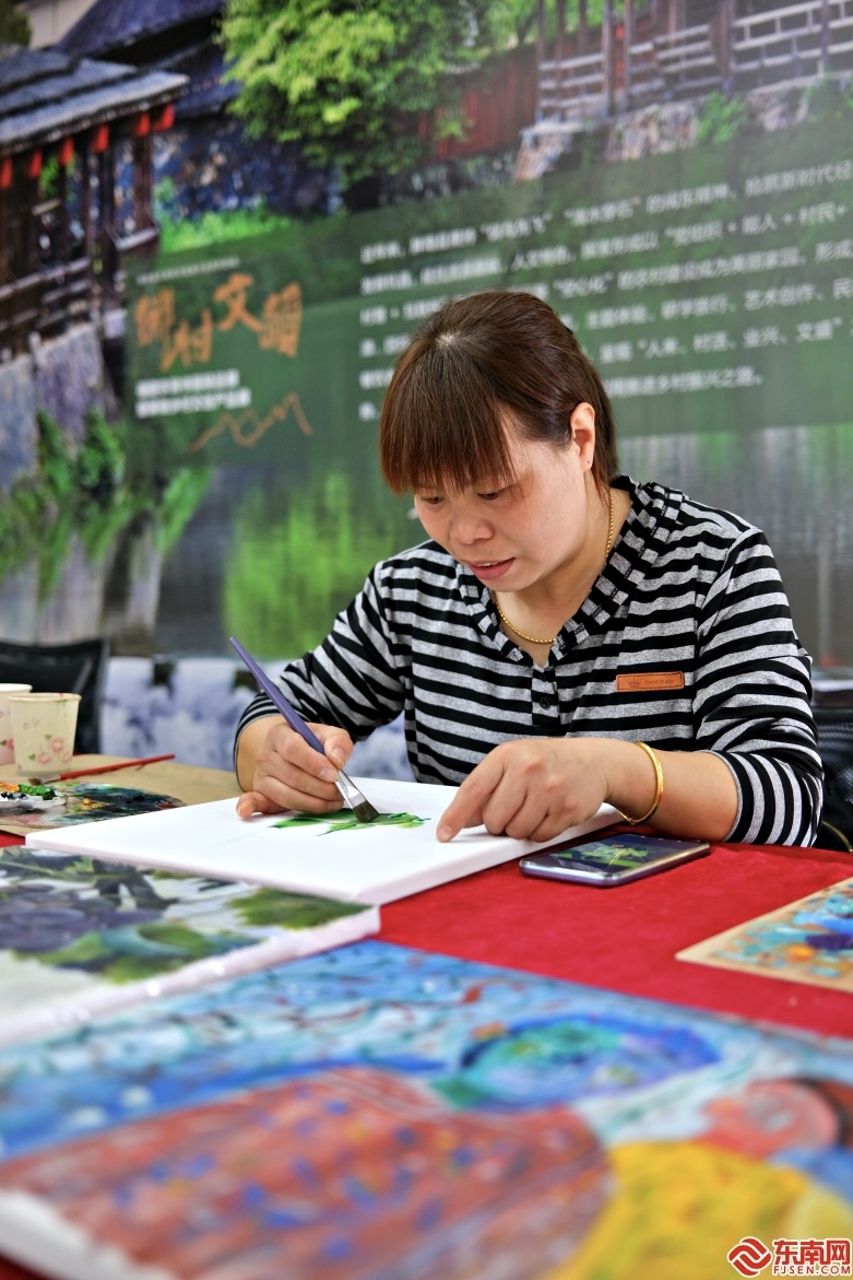 屏南县漈下古村农民画师黄余清在展厅现场作画