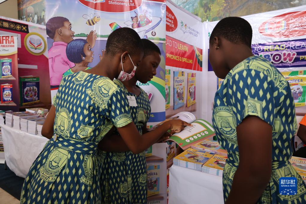 4月24日,在加纳首都阿克拉举办的图书展上,几名学生在阅读图书。