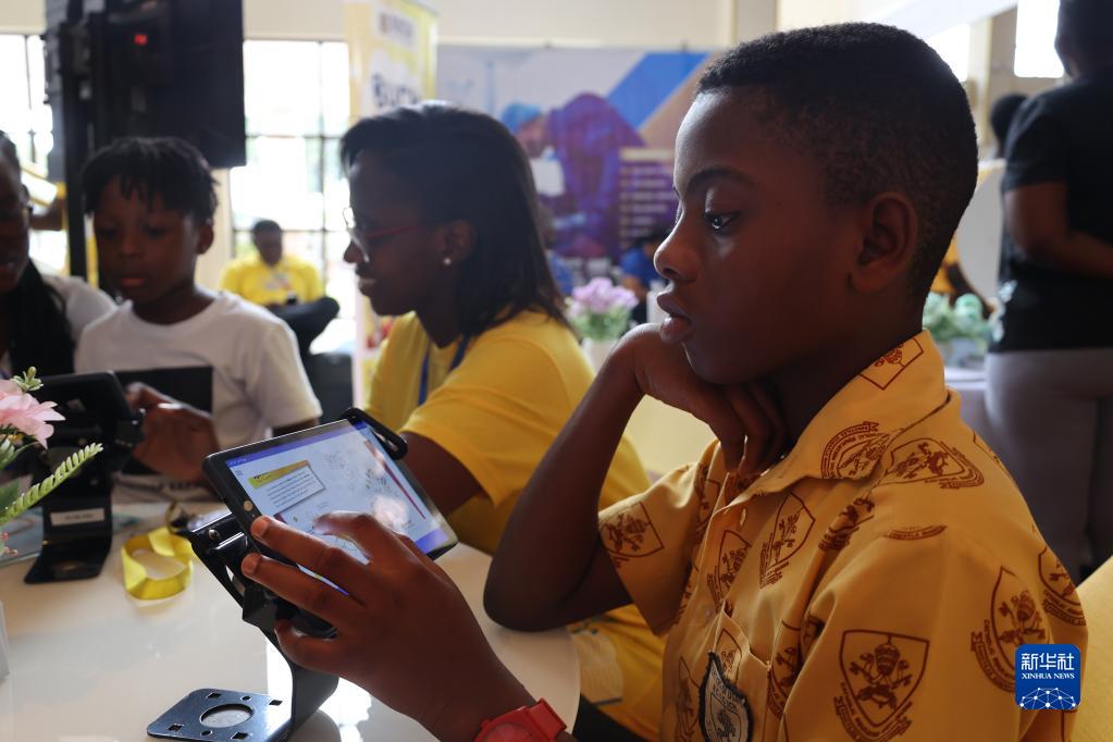 4月24日,在加纳首都阿克拉举办的图书展上,几名学生在平板电脑上阅读。