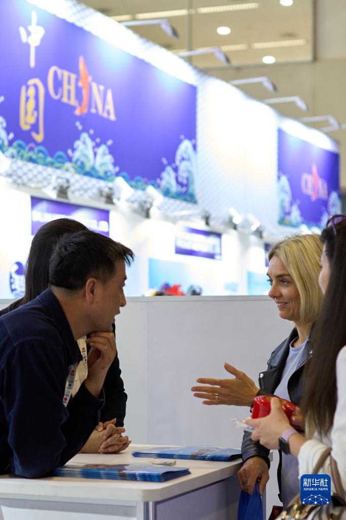4月25日,在西班牙巴塞罗那举行的全球水产品博览会上,参展商和参观者在中国展区洽谈。