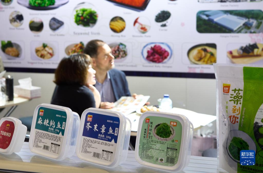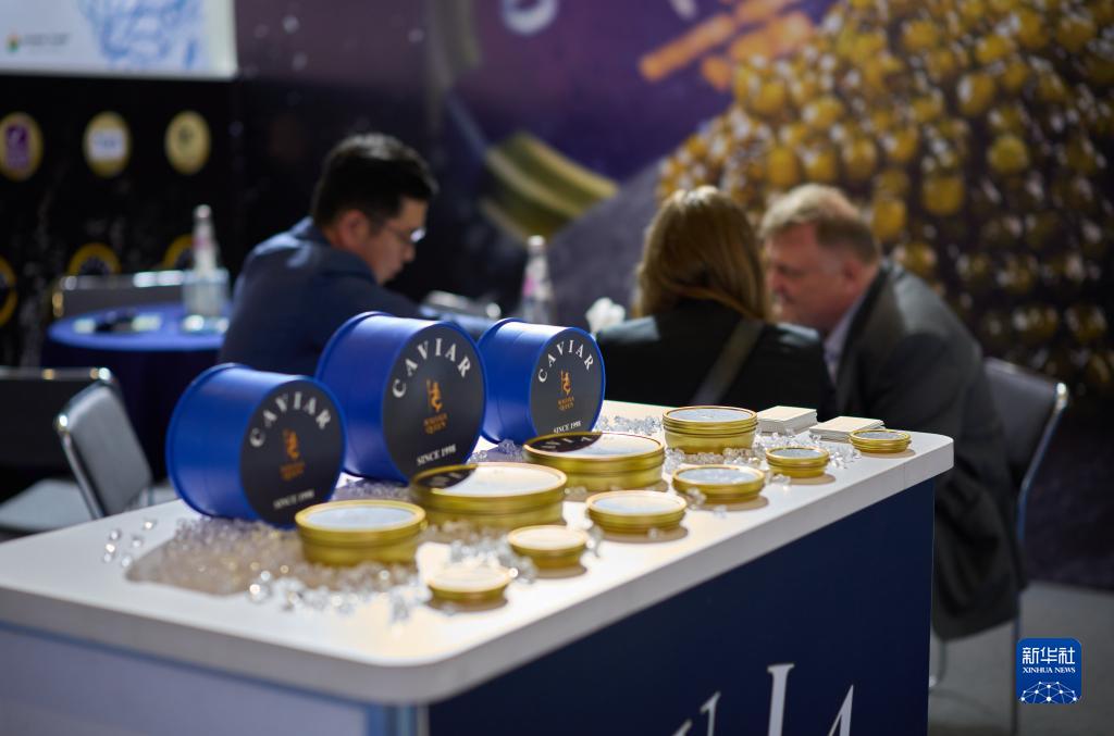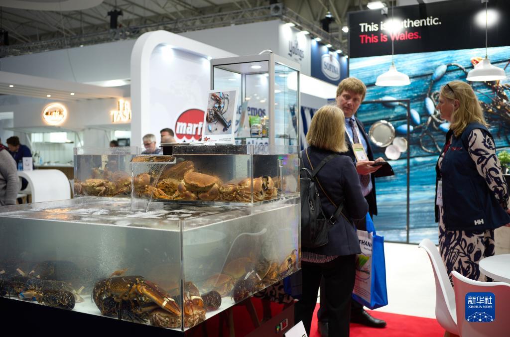 4月25日,在西班牙巴塞罗那举行的全球水产品博览会上,参展商和参观者在一家浙江鱼子酱企业展台洽谈。