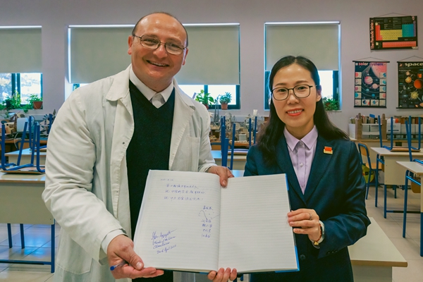 4月24日,马耳他科斯皮夸市,中国第18期援马耳他医疗队队长董晓燕(右)和“中国角”创始人、圣玛格丽特中学科学教师马丁·阿佐帕迪(左)合影。(图片由中国第18期援马耳他医疗队提供)