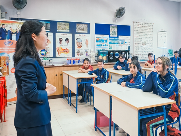 医疗队队长董晓燕主讲,她以中医饮食文化为主题,向学生深入浅出地讲解饮食与健康的关系、强调均衡饮食的重要性。她简单地介绍了生活中常见的因时、因季、因人、因颜色而异的饮食文化,通过大量图片让学生们更直观地了解中医药文化的魅力,并引导学生们养成健康的饮食习惯且坚持下去,现场课堂气氛活跃。