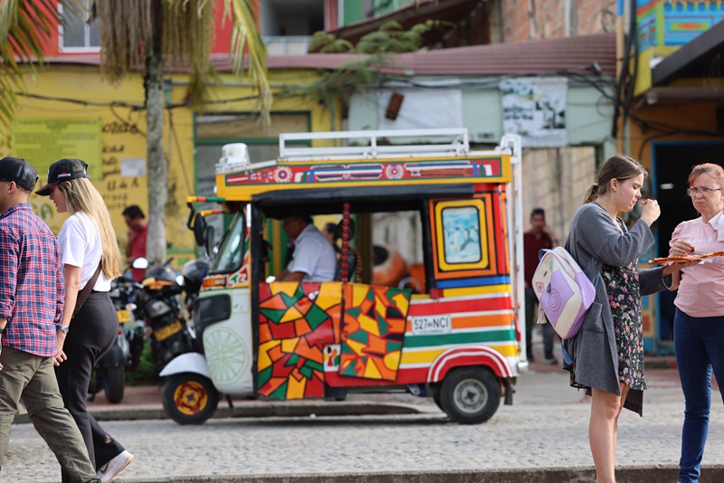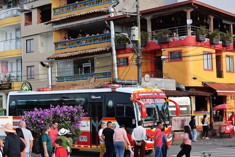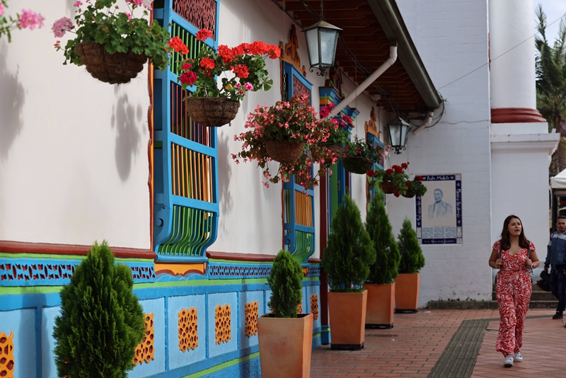 4月31日,哥伦比亚安蒂奥基亚省的瓜塔佩,游客从一栋漂亮的房子前走过。(唐薇 摄)