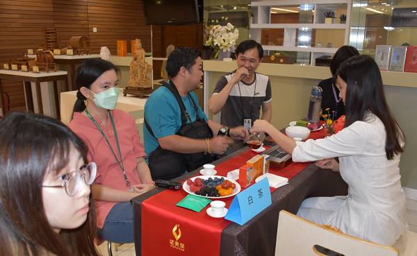 活动现场,播放了 “清新福建”文旅推介短片、《福茶香飘》宣传片等,展示了软木画、寿山石、建盏、瓷器、木雕等福建非遗展品,福建茶制茶流程的木质模型等,集中宣传了福建多元文化和丰富的旅游资源,介绍了入选联合国人类非物质文化遗产代表作名录的“中国传统制茶技艺及其相关习俗”中的六个福建制茶技艺的有关情况,专门设有武夷岩茶(大红袍)、安溪铁观音、福鼎白茶、福州茉莉花茶、坦洋工夫茶、漳平水仙茶等茶席,让马来西亚当地嘉宾沉醉在福建茶乡茶韵之中。