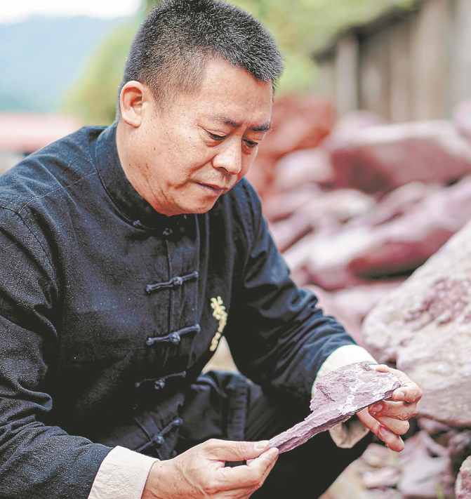 张建忠选取制作茶洋盏的矿石原料 黄杰敏 摄