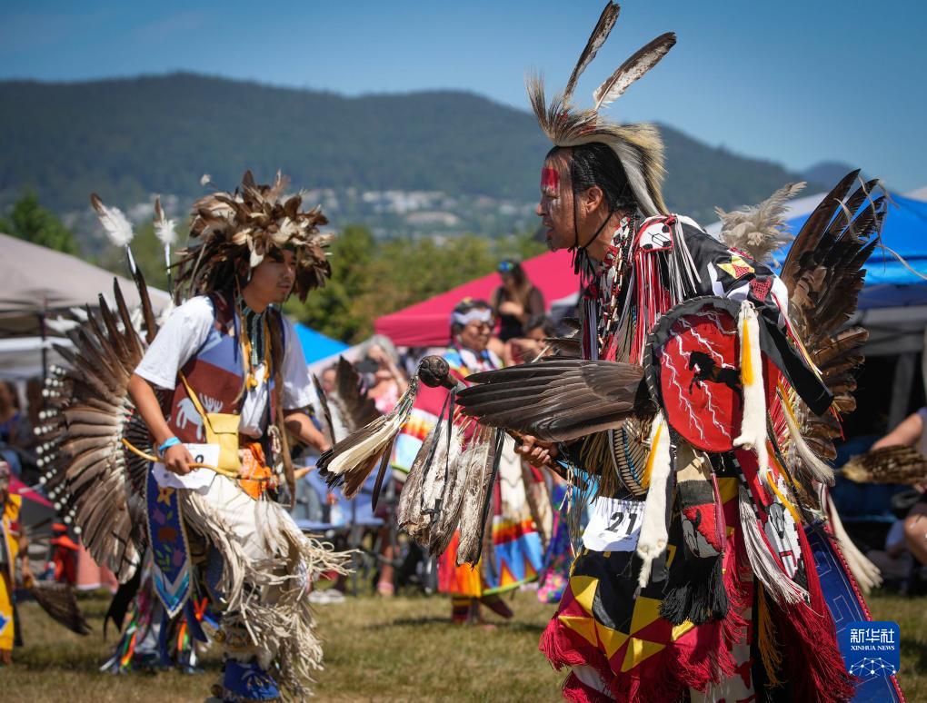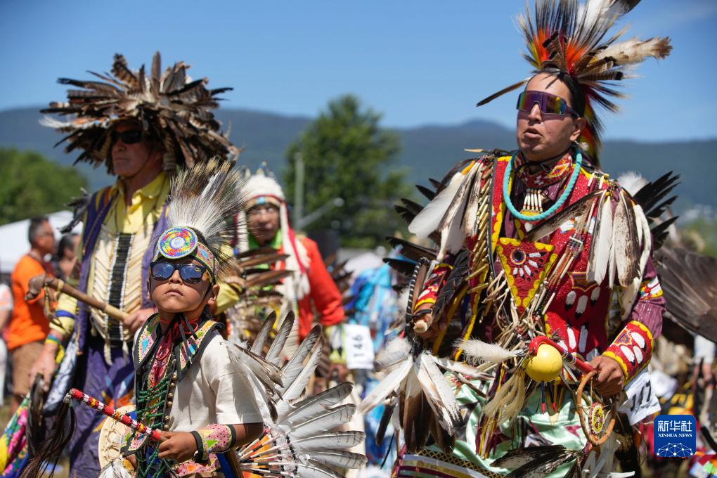 7月15日,在加拿大温哥华,穿着传统盛装的印第安原住民参加“帕瓦”活动。