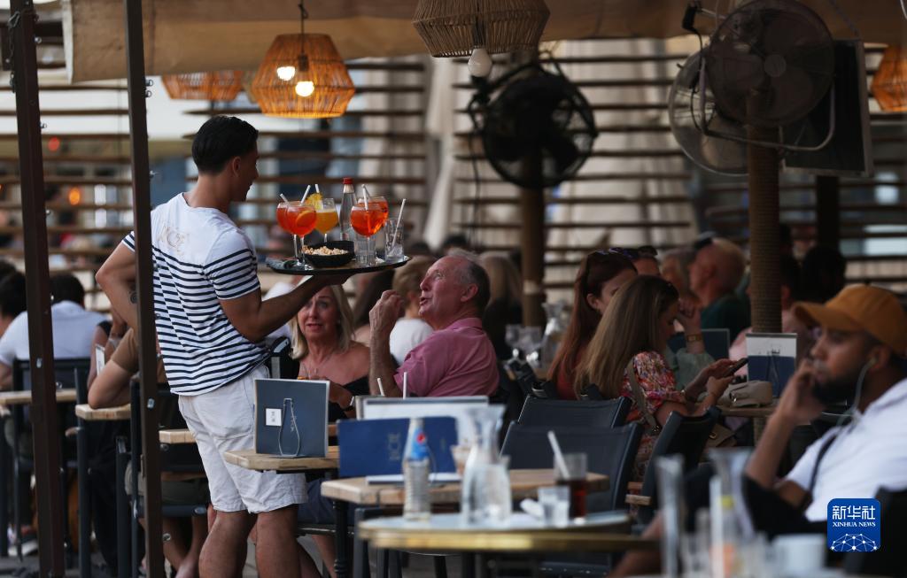 7月18日,人们在法国蒙彼利埃喜剧广场附近就餐休闲。