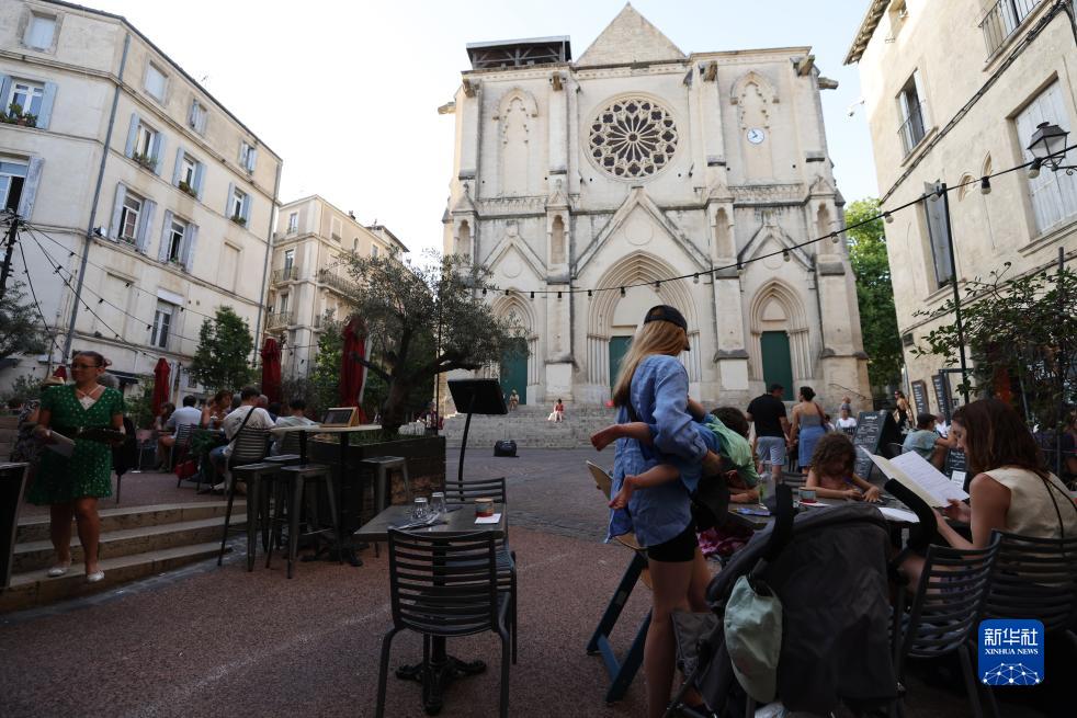 7月17日,人们在法国蒙彼利埃的圣罗克教堂前用餐。