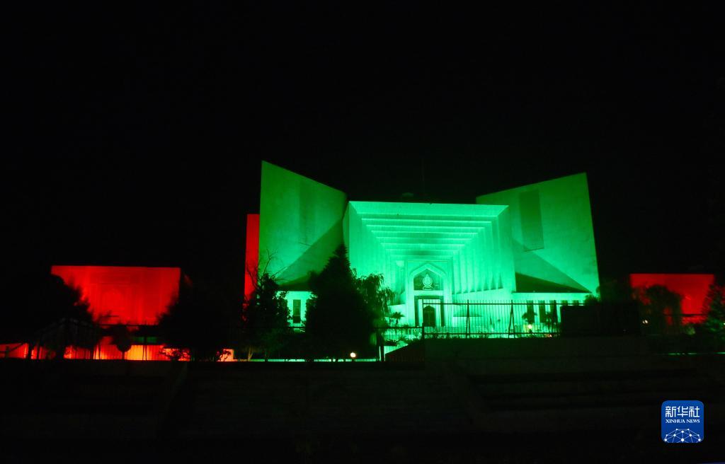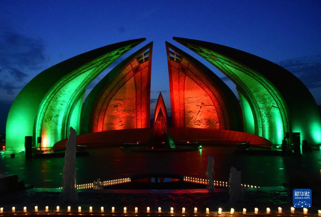 近日,巴基斯坦首都伊斯兰堡地标建筑亮起中巴两国国旗颜色灯光,庆祝中巴经济走廊启动十周年。