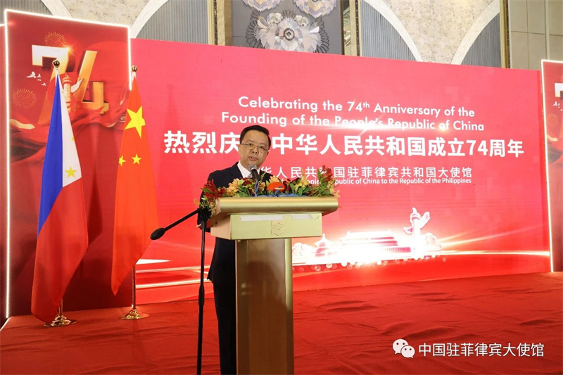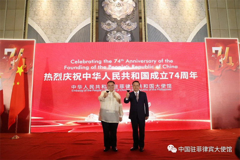 2023年9月21日,中国驻菲律宾大使馆在马尼拉举行招待会,庆祝中华人民共和国成立74周年。菲律宾副总统兼教育部长莎拉·杜特尔特用中英双语发表视频致辞,菲代理外长多明戈、财长乔克诺、贸工部长帕斯卡尔,参议院少数派领袖皮门特尔、参议员埃斯库德罗,众议院少数派领袖利巴南、秘书长维拉斯科、界别党联盟秘书长妮基、外委会主席阿里纳斯、多数派副领袖嘉琳,菲军副参谋长盖尔兰,菲总统中国事务特使许智钧、颜杰奇,阿尔拜省省长拉格曼、卡加延省省长曼巴、卡坦端内斯省省长约瑟夫,政府有关部门负责人,以及菲华商联总会理事长施东方、菲华各界联合会主席蔡永宁、菲律宾中国商会会长侯世练等华社侨领和社会各界友好人士,其他国家驻菲使节、国际组织代表和驻菲中资机构、外派教师、留学生、媒体智库人士近千人出席。