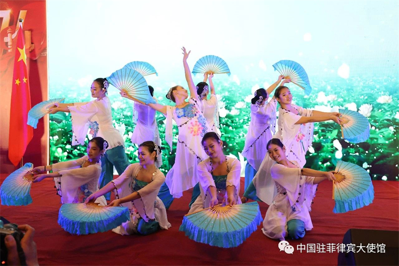 招待会现场展出了“新时代中国的非凡十年”图片展,设置了杭州亚运会纪念品展台和中资企业展台,播放了反映中国经济社会发展伟大成就和中菲务实合作丰硕成果的短片,表演了具有中菲民族特色的文艺节目。与会嘉宾们纷纷祝贺中华人民共和国成立74周年,盛赞中国取得举世瞩目的经济社会发展成就,预祝杭州第19届亚运会、第三届“一带一路”国际合作高峰论坛等盛事取得圆满成功,期待中菲关系行稳致远,造福两国人民。