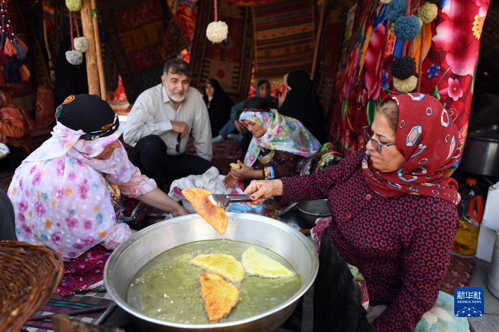 10月5日,在伊朗首都德黑兰,人们身着传统服饰制作特色美食。