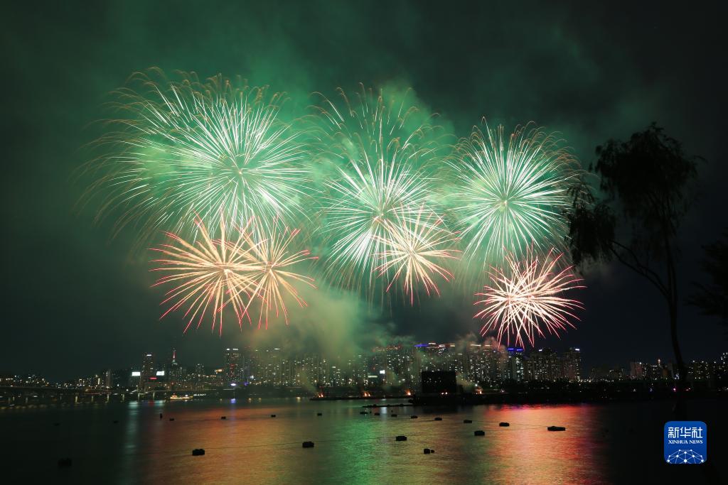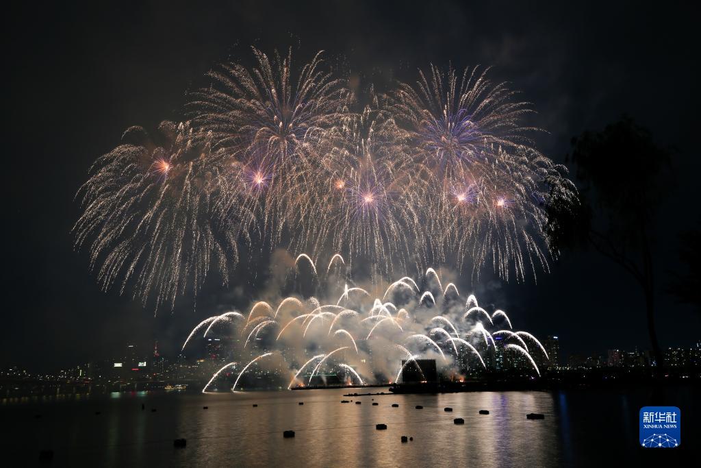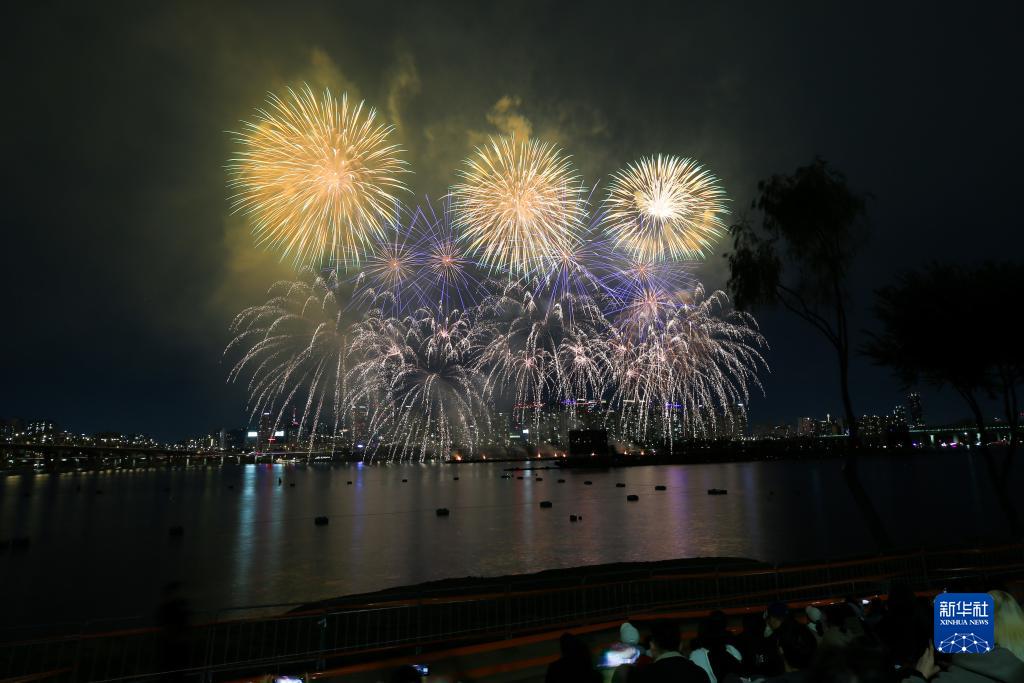当日,首尔国际烟花节在韩国首尔汝矣岛汉江公园一带举行,绚丽烟花点亮了首尔夜空。新华社记者 王益亮 摄
