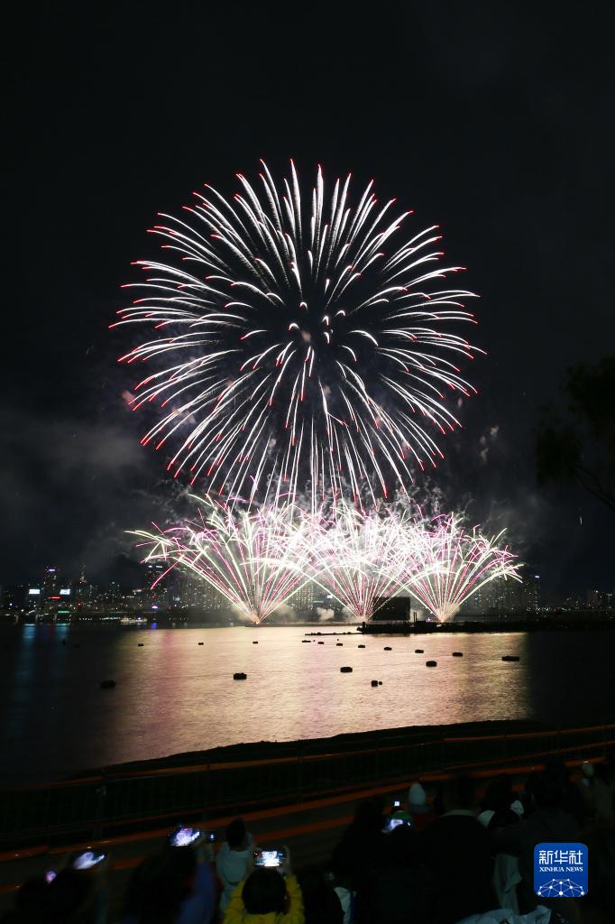 10月7日,人们在韩国首尔国际烟花节上欣赏来自中国的烟花表演。