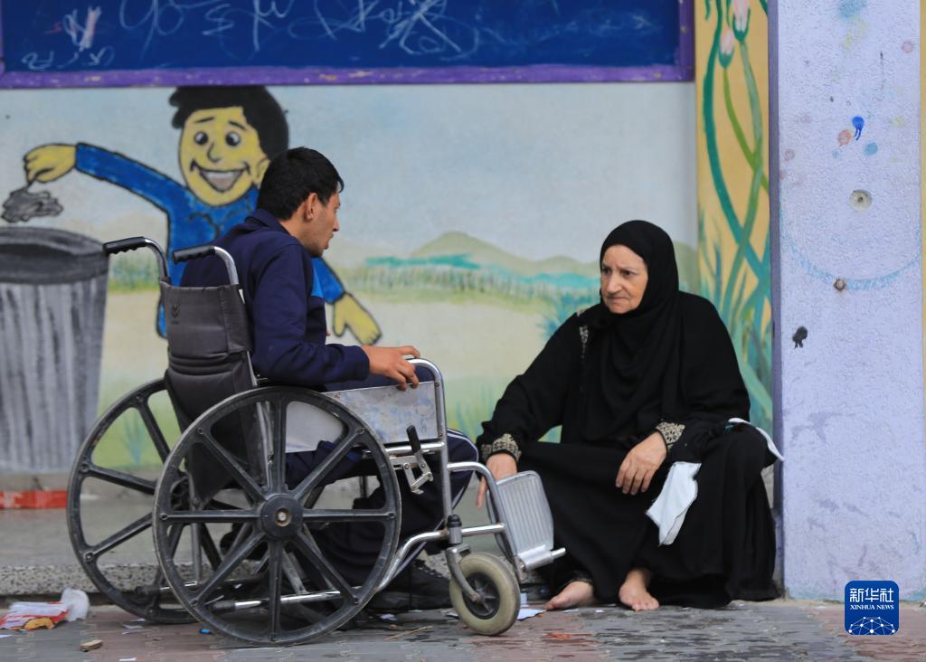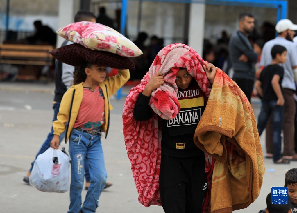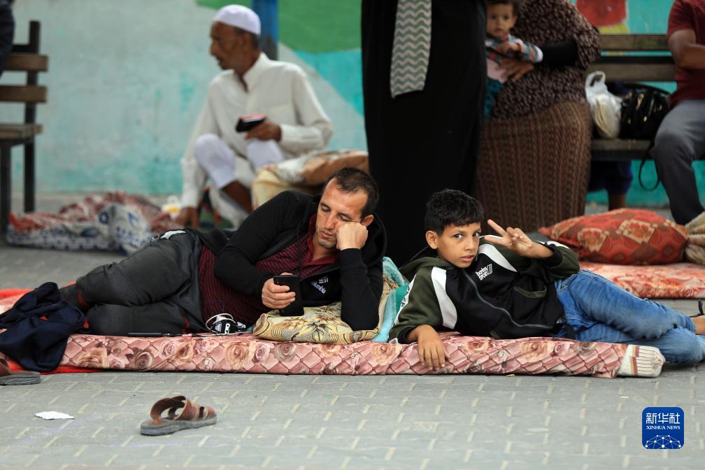 10月9日,巴勒斯坦人在加沙地带南部城市汗尤尼斯的一所学校躲避以色列空袭。新华社发(亚西尔·库迪摄)
